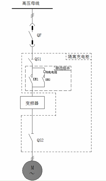 考慮到用戶(hù)現場(chǎng)電網(wǎng)容量有限、電機功率較大。為了避免在送電瞬間的沖擊電流,故在主回路中增加充電電阻。用來(lái)減小沖擊電流及控制母線(xiàn)電壓降。主回路采用真空接觸器并實(shí)現在完成充電后自動(dòng)投切。采用現場(chǎng)控制箱和DCS系統對高壓變頻器進(jìn)行控制、監測。