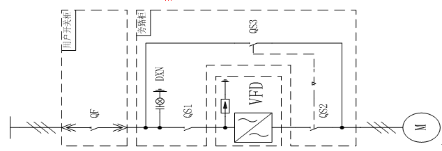 合QS3、分QS1、QS2為工頻模式。電機可由QF直接啟停并進(jìn)行保護,變頻器可完全和電網(wǎng)脫離,便于維護與檢修。