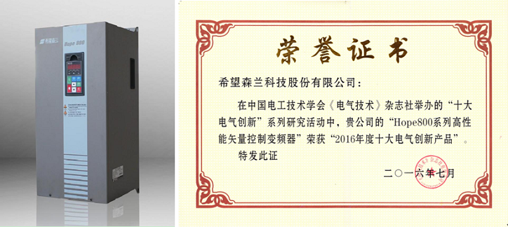 論壇召開(kāi)期間,舉行第七屆十大電氣創(chuàng )新產(chǎn)品、論壇年度創(chuàng )新產(chǎn)品展示活動(dòng)。希望森蘭Hope800系列高性能矢量控制變頻器榮獲“2016年度十大電氣創(chuàng )新產(chǎn)品”。