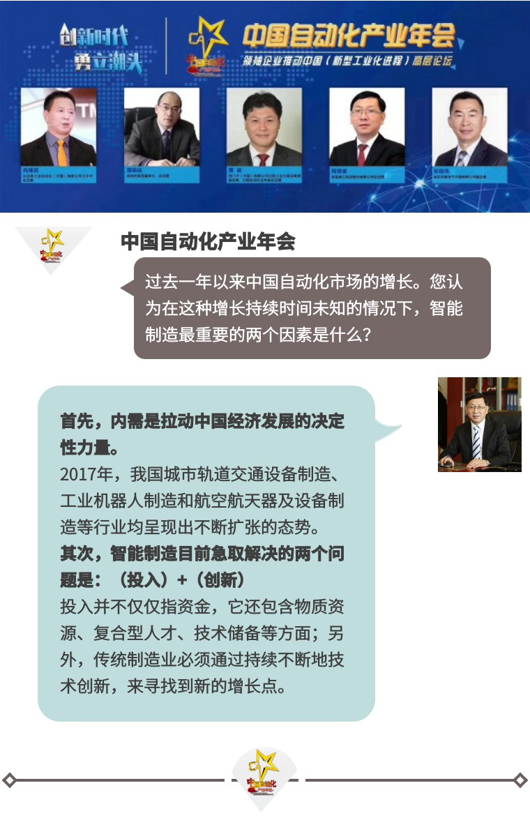 針對過(guò)去一年以來(lái)中國自動(dòng)化市場(chǎng)的增長(cháng)的原因、持續時(shí)間,以及智能制造的組成因素等問(wèn)題,論壇主持人對中國自動(dòng)化產(chǎn)業(yè)的領(lǐng)袖企業(yè)高層進(jìn)行了逐一采訪(fǎng)。